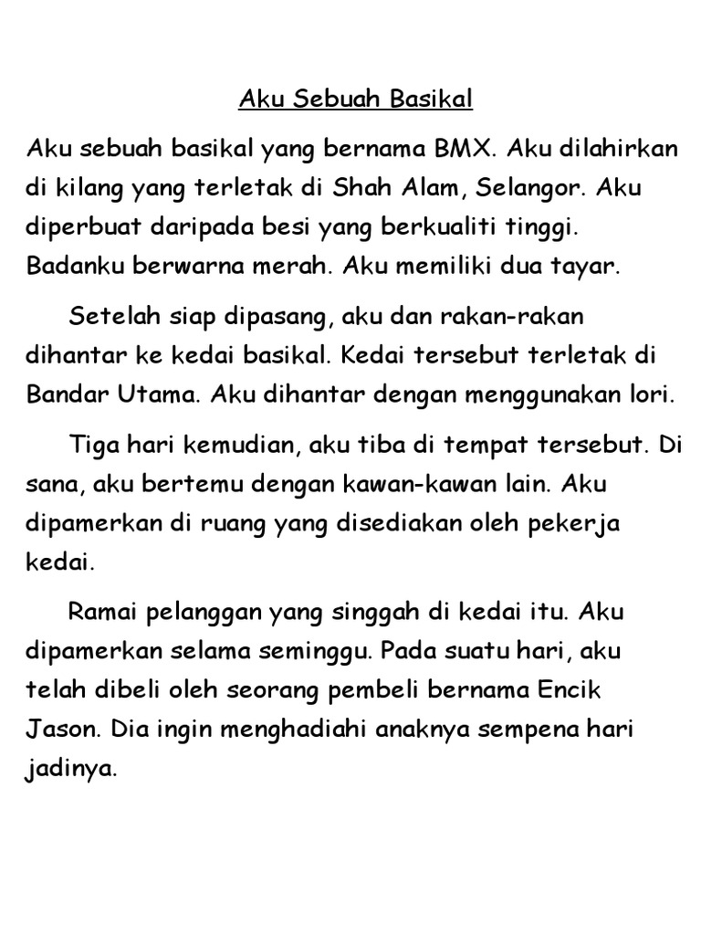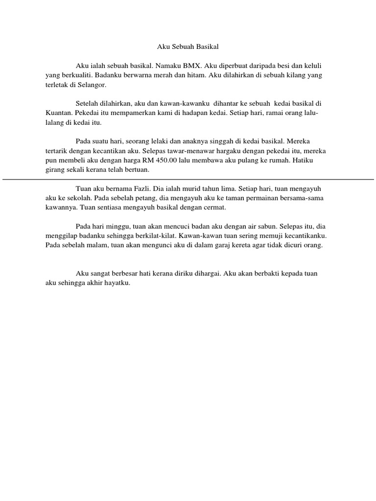 Patutlah wanita ini membeli aku yang mahal. Documents similar to contoh karangan aku sebuah basikal. Aku dilahirkan di sebuah kilang yang terdapat di Selangor Darul Ehsan.